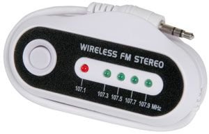 A compact transmitter which allows you to play an MP3, MD, CD, DVD, PDA, Laptop etc through your home or in-car stereo system.