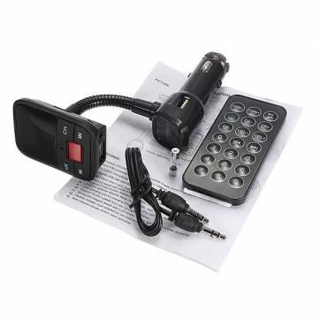 PRODUCT DESCRIPTIONS:Features:1.Built-in Bluetooth Technology 2.Built-in Microphone for Hands-Free Phone Calls 3.Wirelessly Stream Audio or Internet Radio from Your Smartphone 4.USB Flash and Micro SD Card Readers 5.Quickly Plug-in and Play Your MP3/WMA Files 6.AUX Input (3.5mm Jack) for Connecting Additional Devices 7.Full Frequency FM Transmitter: 87.5-108MHZ 8.Hands-Free Mode Automatically Switches To Incoming Calls When Playing Music 9.Supports 4 Loop Modes: Repeat All, Random, Repeat One, Folder 10.Selectable EQ Settings: Natural, Rock, Pop, Classic, Jazz 11.Additional USB Port For Charging Your Devices (Output: DC 5V/2.1A) 12.Supports 12-24V Via Car Cigarette Lighter 13.LCD Display and Button Controls 14.Flexible and Adjustable Gooseneck Arm 15.Includes Remote Control and 3.5mm CableSpecifications:1.Connect the Bluetooth Transmitter into your vehicle's cigarette lighter to enable a wide range of multimedia options. 2.Wirelessly stream audio and answer calls via Bluetooth, play MP3 and WMA files with the built-in USB Flash drive and Micro SD Card Readers, connect additional devices via the 3.5mm AUX Input, listen to your favorite FM Radio station, and best of all, do it all while you charge your device with the USB Charging Port conveniently located on the device. 3.Enjoy the power and versatility of this compact and multi functional Bluetooth FM Transmitter.Package Included:1 x Bluetooth FM Transmitter( USB Flash drive not included) 1 x Remote controller 1 x 3.5mm Aux-in Cable 1 x Fuse Wire 1 x User Mannual