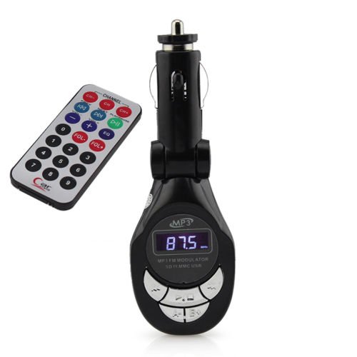 1. For use with MP3,VCD or DVD Players (connected by an audio cable). 2. Transmitting Distance: up to 5 meters. 3. Apply for Flash Drive and MP3 Player. 4. Read MP3/WMA file from the USB port, SD / MMC card directly. 5. Built-in FM transmitter. 6. FM transmitter range: 87.5 to 108.OMHz. 7. LCD show the radio frequency. 8. Digital song With Mini Remote Controller., directly digital set frequency. 9. Powered with the car cigarette lighter,no need to change any car equipment ,Suitable to any car.